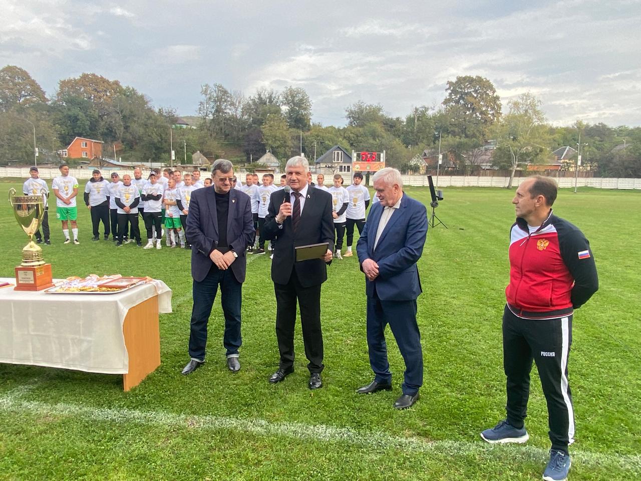 Поэтому 18 октября для вручения кубка и золотых медалей победителям прибыли председатель краевой федерации футбола Перонко И.А., Крохмаль В.В., официальные лица республики и района. Великолепный стадион с естественным газоном, был заполнен тысячами болельщиков, приветствовавших своих любимцев.