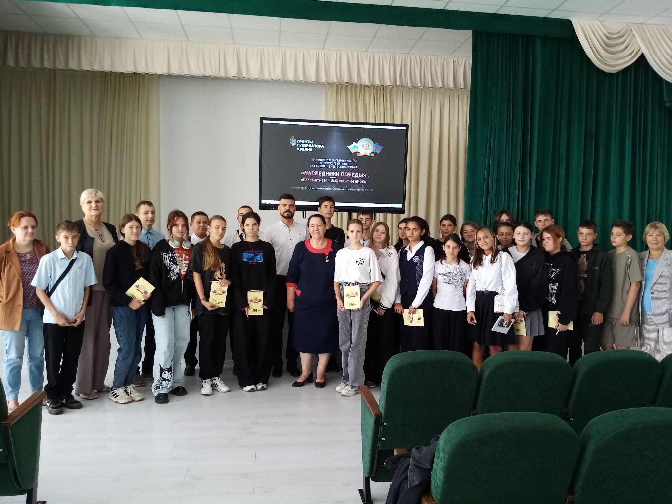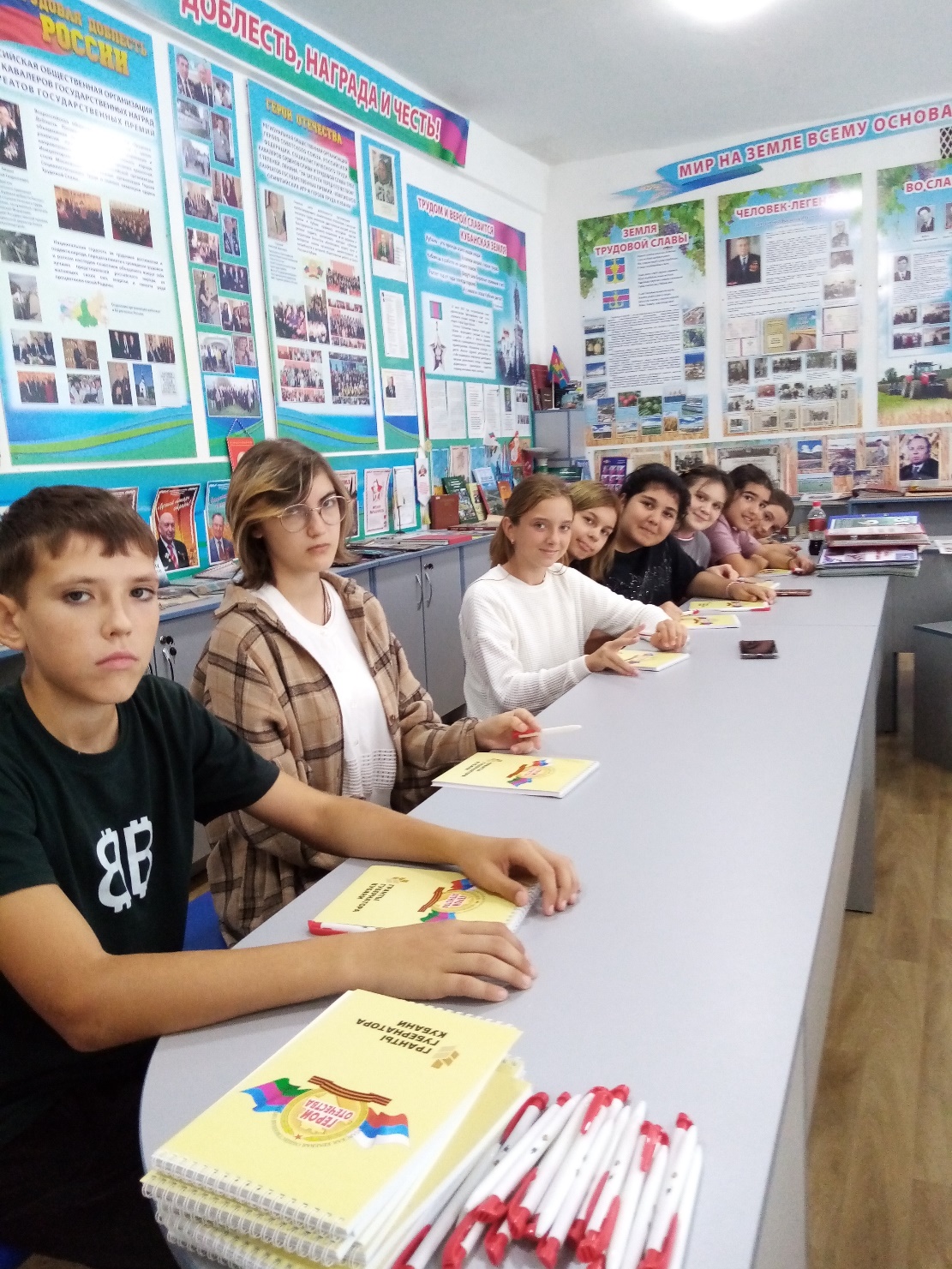 Сфотографировавшись на прощание, гостям от лица учащихся были вручены букеты цветов, а ребята получили блокноты и ручки с символикой организации ККОО «Герои Отечества».