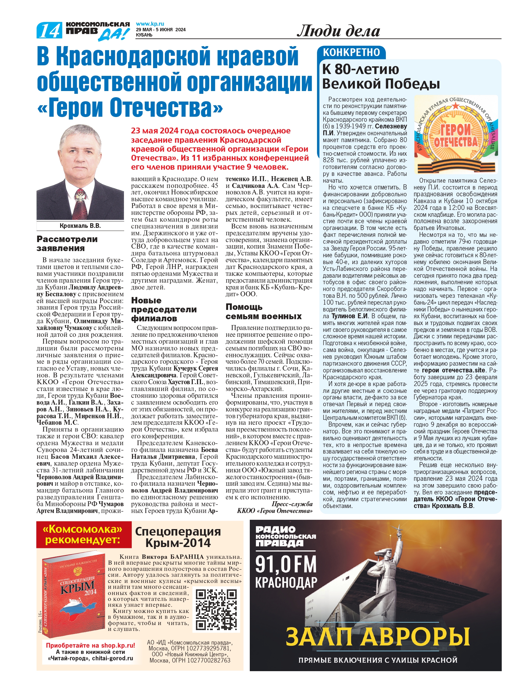 Несмотря на то, что мы недавно отметили 79-ю годовщину Победы, правление решило уже сейчас готовиться к 80-летнему юбилею окончания Великой Отечественной войны. На сегодня принято пока два предложения, выполнение которых надо начинать. Первое организовать через телеканал «Кубань-24» цикл передач «Наследники Победы» о нынешних героях Кубани, воспитанных на боевых и трудовых подвигах своих предков и земляков в годы ВОВ. Диски с этими передачами распространить по всему краю, особенно в местах, где учится и работает молодежь. Кроме этого информацию разместим на сайте герои отечества.site. Работу завершим до 23 февраля 2025 года, стремясь провести ее через грантовую поддержку Губернатора края.
