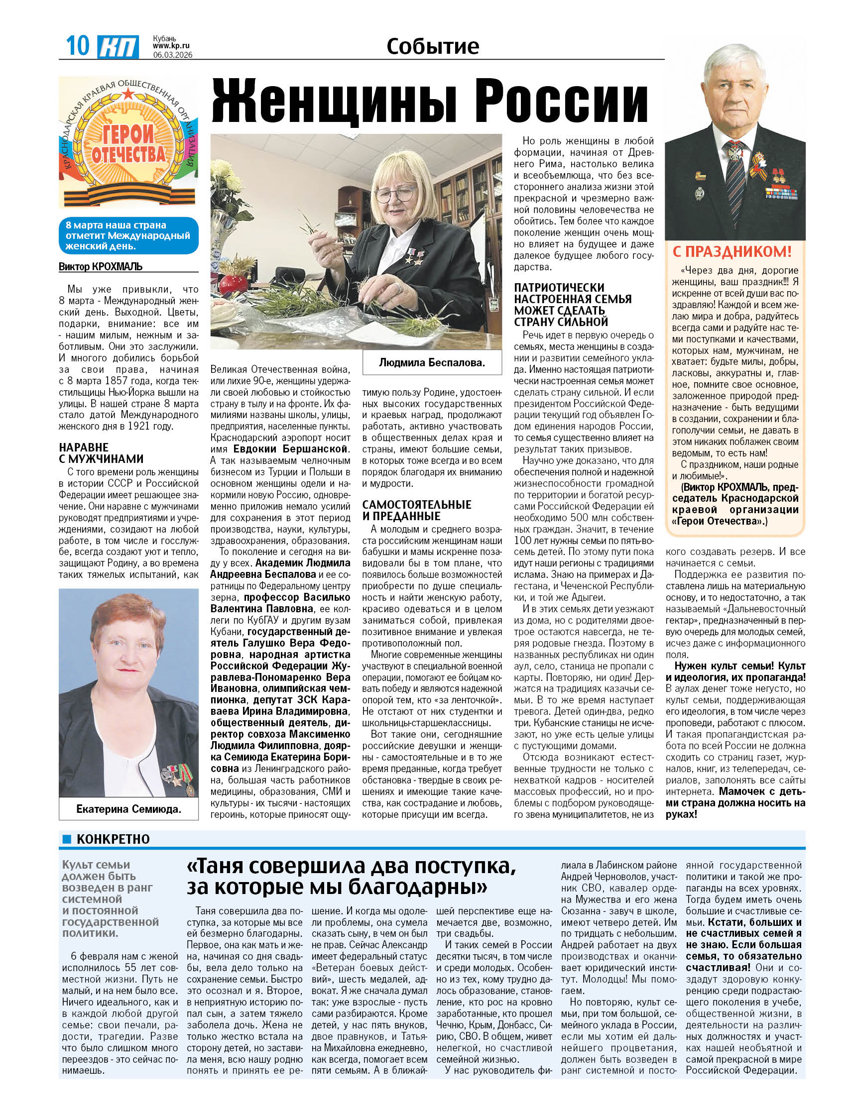 6 марта 2026 г. в газете «Комсомольская правда» опубликована статья председателя Краснодарской краевой организации «Герои Отечества» Виктора Васильевича Крохмаля «Женщины России» к Международному женскому дню 8 Марта.
